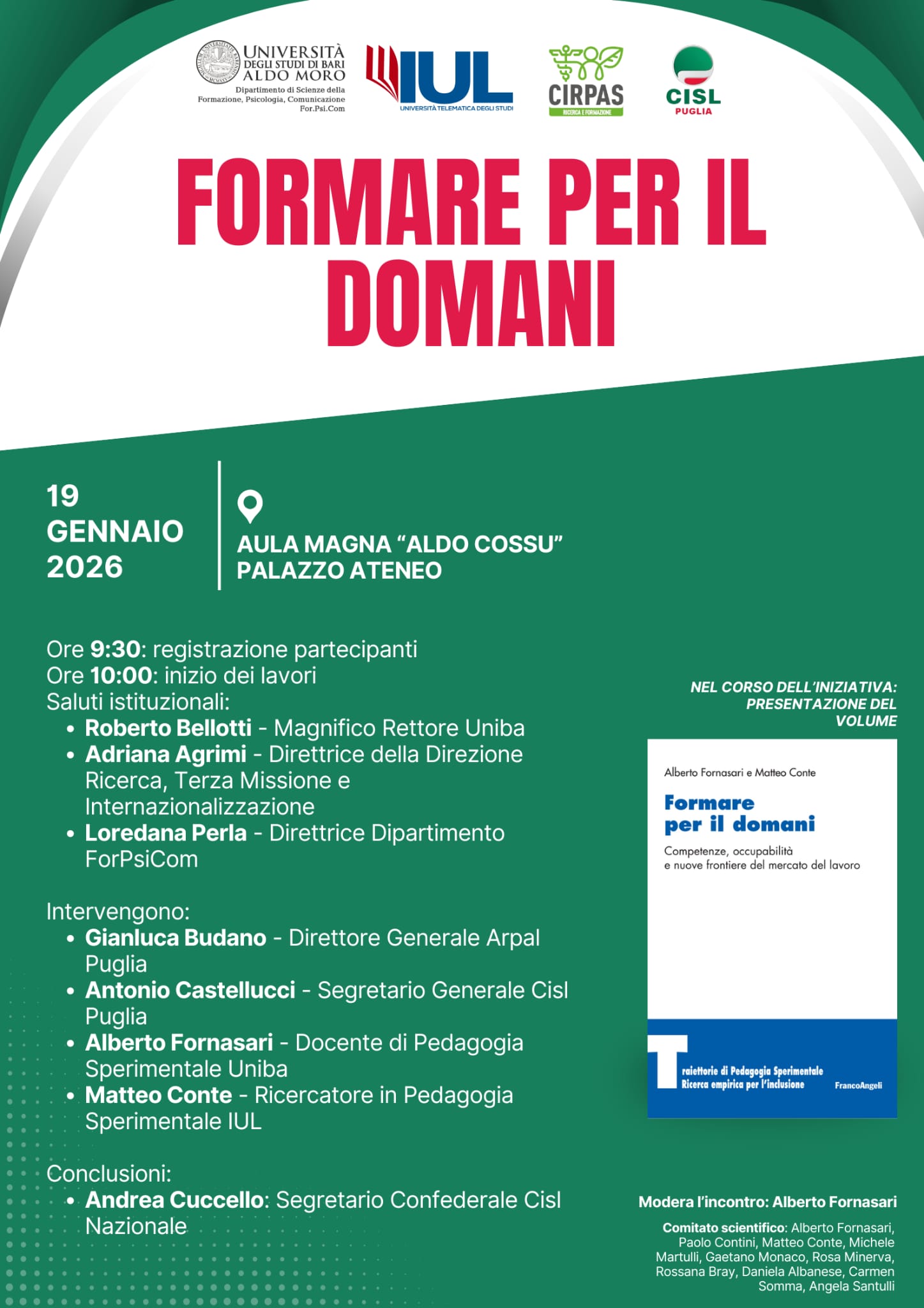 Si terrà lunedì 19 gennaio, presso l'Aula Magna "Aldo Cossu" di Palazzo Ateneo dell'Università degli Studi di Bari, il convegno "Formare per il Domani". L’evento, promosso dal Dipartimento di Scienze della Formazione, Psicologia, Comunicazione metterà al centro del dibattito i temi cruciali delle competenze, dell'occupabilità e delle nuove frontiere del mercato del lavoro.