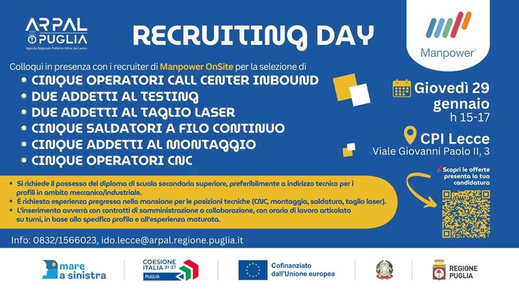 Giovedì 29 gennaio 2026, il Centro per l’Impiego di Lecce ospita il Recruiting Day organizzato da Arpal Puglia e Manpower srl. L’appuntamento è presso gli uffici di viale Giovanni Paolo II n.3, dalle ore 15:00 alle ore 17:00.