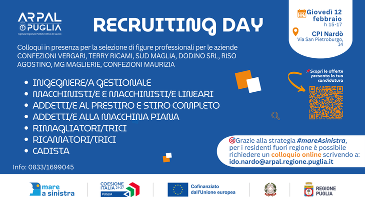 Giovedì 12 febbraio 2026, il Centro per l’Impiego di Nardò ospiterà il Recruiting Day organizzato da Arpal Puglia . L’appuntamento è presso gli uffici di via San Pietroburgo 25, dalle ore 15:00 alle ore 17:00.