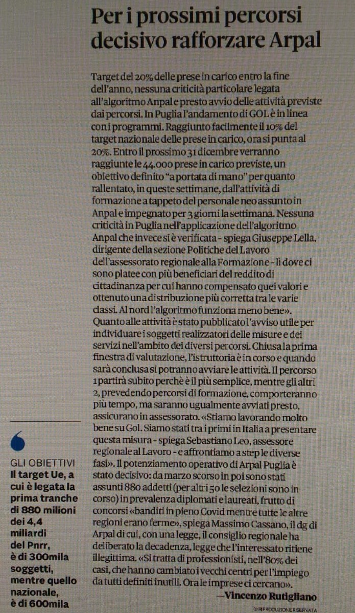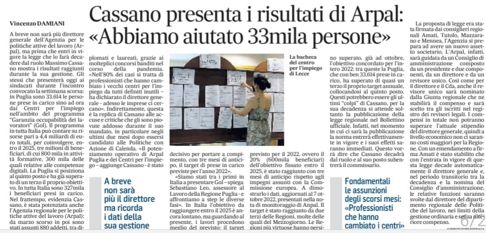 Con ben 33.614 prese in carico, la Regione ha superato di quasi un terzo il proprio target annuale. “Siamo stati tra i primi in Italia a presentare il GOL – spiega Sebastiano Leo, Assessore al Lavoro della Regione Puglia, in un articolo pubblicato oggi su Il Sole 24 Ore – e affrontiamo a step le diverse fasi”. Il potenziamento operativo di ARPAL è stato decisivo in questo. Da marzo scorso in poi sono stati assunti 880 addetti, tra diplomati e laureati, grazie ai molteplici concorsi banditi nel corso della pandemia. “Nell’80% dei casi si tratta di professionisti che hanno cambiato i vecchi centri per l’impiego da tutti definiti inutili – ha dichiarato il Direttore Generale di ARPAL, Massimo Cassano - Adesso le imprese ci cercano”.